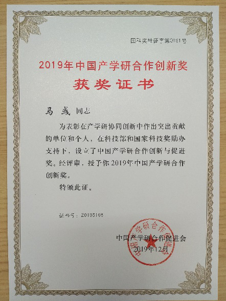 2019年12月30日,我院开云官方官网登录入口马彧教授在第十三届中国产学研合作创新大会上荣膺“2019年中国产学研合作创新奖”。